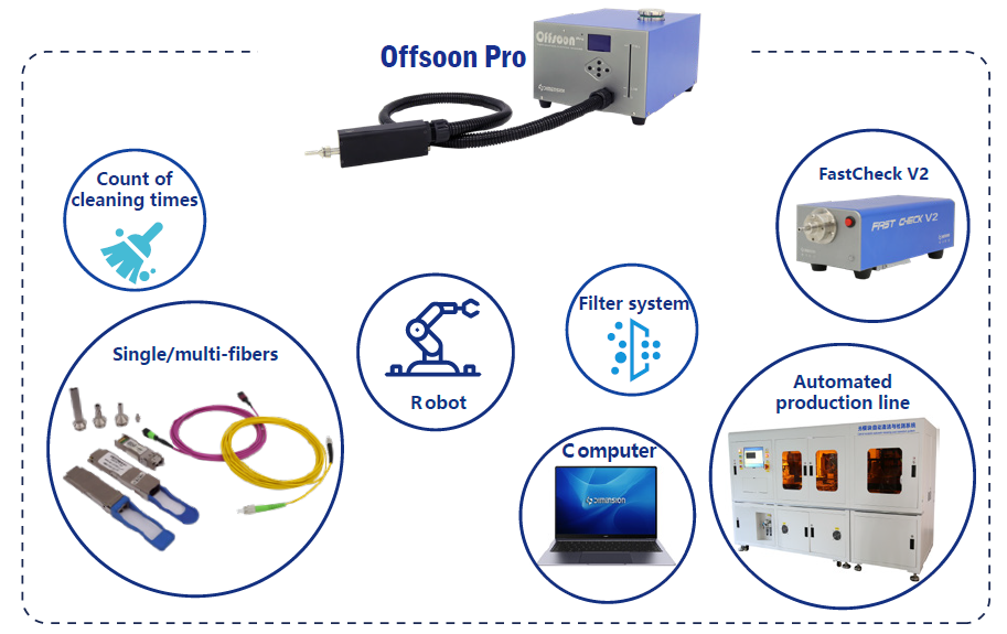 Offsoon Pro เป็นเครื่องทำความสะอาดพื้นผิวของใยแก้วนำแสงทั้งเส้นใยเดี่ยวและหลายเส้นใยแบบอัตโนมัติ ที่เพิ่งเปิดตัวโดย Dimension โดยยังคงข้อดีเดิมไว้ วงจรก๊าซในตัวและวงจรของเหลวได้รับการอัพเกรดและหน้าจอแสดงผลแบบภาพและมีการเพิ่มปุ่มที่สามารถตั้งค่าได้ ซึ่งมีผลในการทำความสะอาดที่ดีขึ้น เชื่อถือได้มากขึ้น และใช้งานง่ายขึ้น ด้วยการกำหนดค่าความแม่นยำที่หลากหลาย การทำความสะอาดอินเทอร์เฟซ สามารถทำความสะอาดส่วนท้ายของตัวเชื่อมต่อไฟเบอร์ ส่วนประกอบออปติก โมดูลออปติคัล และ MT ได้อย่างมีประสิทธิภาพ