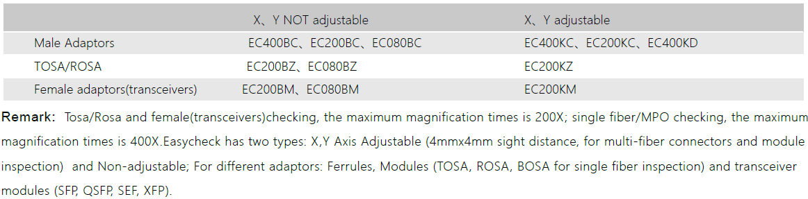 Easycheck สามารถตรวจสอบตัวเชื่อมต่อ、โมดูล (-TOSA、ROSA) และรุ่นที่ปรับได้สามารถตรวจสอบตัวเชื่อมต่อแบบมัลติไฟเบอร์ได้