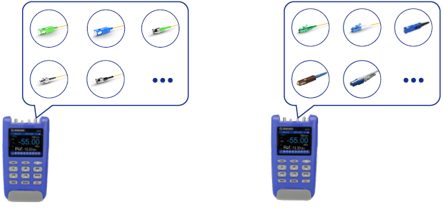 เพื่อปรับให้เข้ากับสถานการณ์การทดสอบทั่วไปทั้งหมดในตลาด หัววัดแบบออปติกได้รวมอะแดปเตอร์สากล 2.5 มม., อะแดปเตอร์สากล 1.25 มม., อะแดปเตอร์ประเภทโพรบ SC และอะแดปเตอร์ประเภทโพรบ LC เมื่อจำเป็นต้องทำงานวัดให้เสร็จในระดับต่างๆ และใช้ตัวเชื่อมต่อไฟเบอร์/แผงกั้นแบบต่างๆ ผู้ใช้ไม่จำเป็นต้องพกสายแพตช์สำหรับแปลงเพิ่มเติม