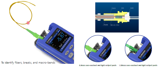 หัววัดออปติคอลมาพร้อมกับพอร์ตเอาต์พุตแสงสีแดงแบบไม่สัมผัส 2.5 มม. และ 1.25 มม. การออกแบบแบบไม่สัมผัสจะไม่ทำให้ส่วนปลายเสียหายเนื่องจากการเสียบปลั๊กและถอดปลั๊ก และการออกแบบพอร์ตเอาต์พุตแสงสีแดงขนาด 2.5 มม. และ 1.25 มม. เหมาะสำหรับสถานการณ์การใช้งานส่วนใหญ่ อุปกรณ์นี้มีโหมดการส่งสัญญาณแสงสองโหมด (ต่อเนื่อง กะพริบ) เพื่อระบุเส้นใย การหัก และการโค้งงอแบบมาโคร